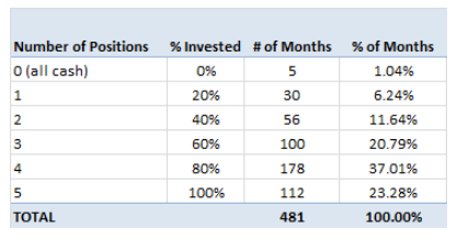아래의 도표는 보유 자산군별로 보유 개월 수의 비중을 보여준다. 상당 부분의 기간 동안 (60~100%) 투자가 유지되는 것을 볼 수 있다. 대략 80%의 기간 동안 최소 60%는 자산에 투자되고 있으며, 평균적으로 70% 정도를 투자한다.
