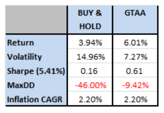 아래는 GTAA와 B&H 비교해 보았다. GTAA는 5개 자산군에 마켓 타이밍을 적용하고, B&H는 5개 자산군에 동일 비중으로 투자한 것이다. B&H 괜찮은 수익률을 보여주며 분산 투자의 효과를 입증해 준다.