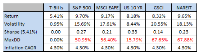 각 자산군들은 역사적으로 꽤 좋은 수익률을 보여주었지만 변동성과 낙폭이 상당히 크다. 최대 낙폭이 20% 미만을 기록한 미국 정부채를 제외한 나머지 4개의 자산군은 – 50%~70%의 최대 낙폭을 보여주었다.