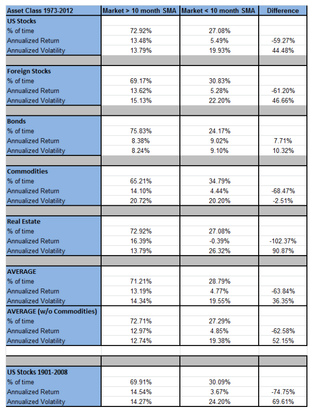 아래의 도표는 이 논문에서 연구한 5개 자산 군의 연 환산 수익률과 변동성을 보여준다. 평균적으로 시장이 10개월 단순 이평 아래에 있을 때 수익률은 60% 도 낮고, 변동성은 30% 더 높다.