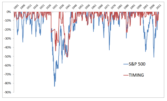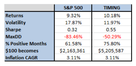 타이밍 모델이 1930년대와 2000년대의 하락장을 잘 피했다. 1920년 후반 ~ 1930년대 초반까지의 약세장은 완전히 피하지는 못했다. 하지만 시장이 -83.66% 하락할 때 -42.24%로 잘 방어했다.