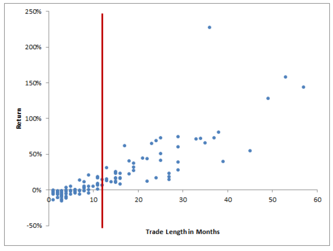 과세 계좌에서 이 모델을 매매해야 하는 사람에게도 이점은 있다. 자산군별로 손실을 보는 횟수는 많지만 수익이 날 때는 매우 긴 기간 동안 수익이 이어지는 특징이 있다. 아래의 도표는 1973년부터 5개의 자산 군의 모든 매매의 분산을 보여준다. 이러한 부분이 투자자의 세금 부담을 줄이는 데 기여한다.