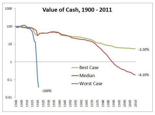 현금은 최고의 경우에도 연평균 -2.3%의 가치가 떨어진다.