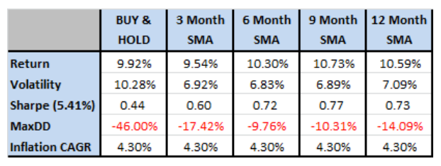 과거 데이터를 연구하고 이동 평균을 최적화했을 가능성이 있다. 그래서 10개월 외에 3, 6, 9, 그리고 12개월 이평도 테스트해 보았다. 이 단순한 전략의 유효성은 매우 일관적으로 나왔다.