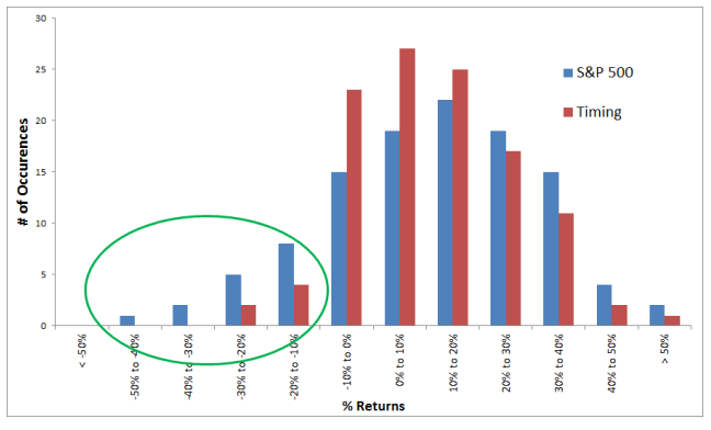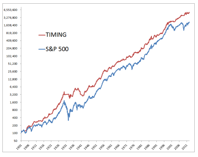 1901년부터 S&P 500의 평균 수익률은 11.26%였고 타이밍 모델은 11.22%였다. 하지만 복리 수익률은 각각 9.32%와 10.18%였다. 매수 후 보유 투자자들은 변동성 효과로 인해 2%의 수익률 하락을 겼는다. 반면에 타이밍 모델은 1% 수준의 손해를 본다.