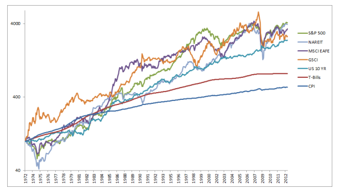 아래는 테스트해 볼 5가지 자산군을 1973년부터 2012년까지의 수익률을 보여준다.