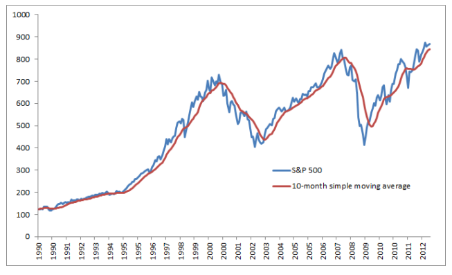 아래는 S&P 500에 10개월 단순 이동 평균선을 적용한 모습이다.
