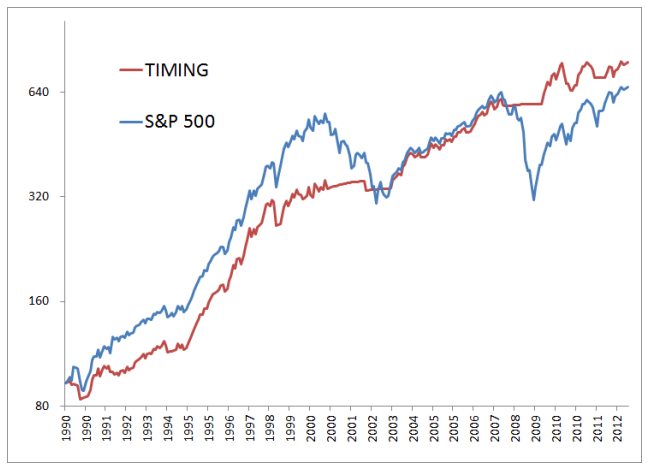 타이밍 모델은 상승장을 추종하고 하락장에는 현금을 보유하는 능력을 보여준다.
