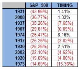 S&P 500이 최악의 성과를 보여준 10개 연도와 타이밍 시스템의 수익률을 비교해 보자.