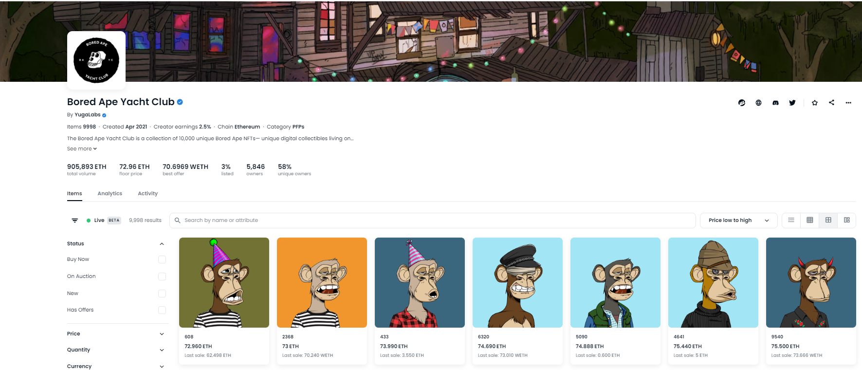 오픈씨 거래량 1위 NFT인 BAYC, 최저가 72.96 ETH,