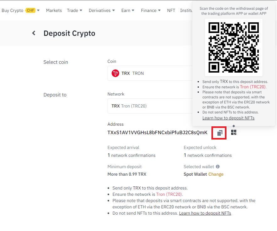 TRX/TRON을 검색 후, Deposit 클릭