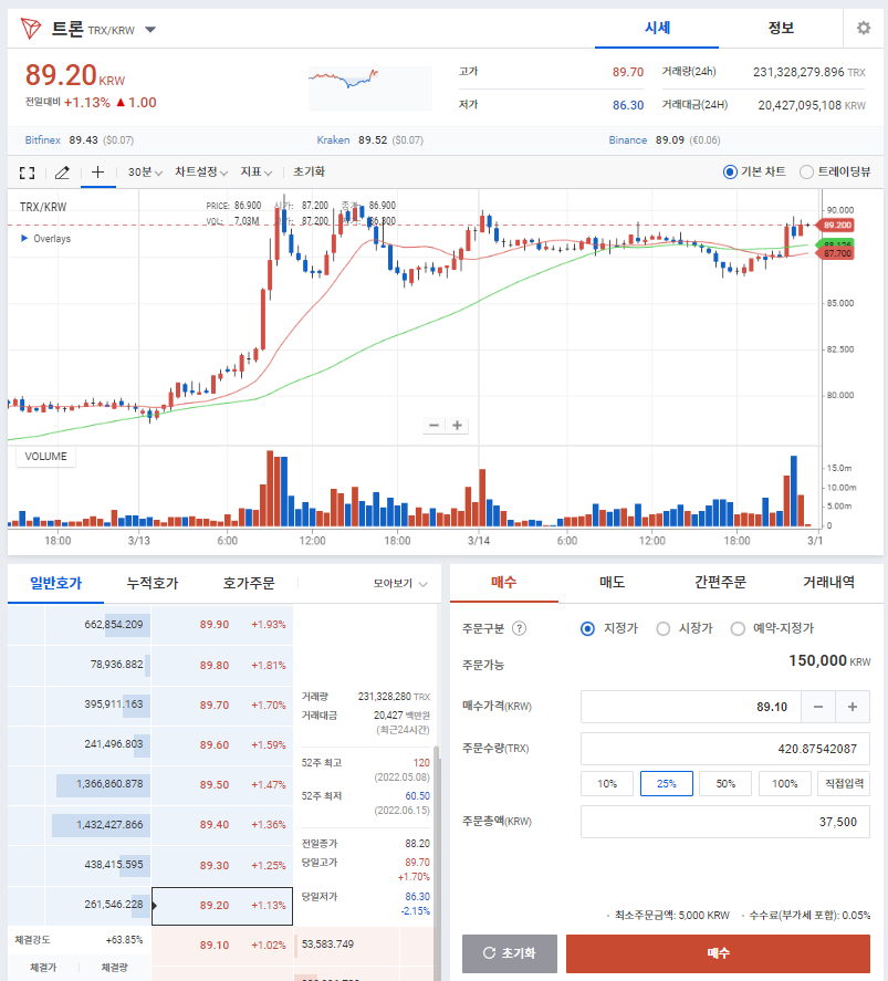 업비트에서 트론(TRX)를 먼저 매수합니다.