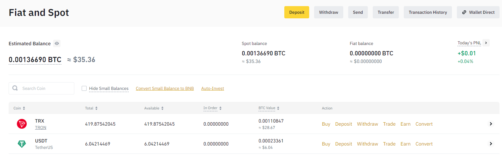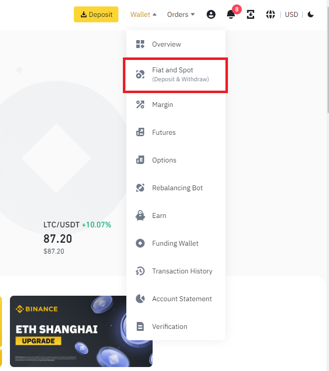 우측 상단에서 Wallet > Fiat & Spot 선택