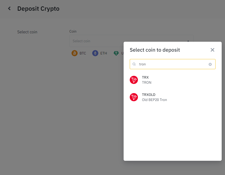 Deposit Crypto 화면에서 TRON을 찾아주세요