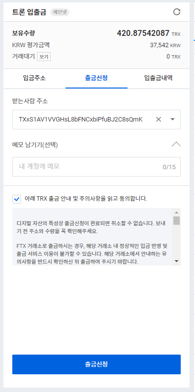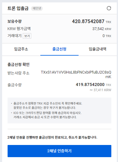 국내 거래소인 업비트에서 트론을 출금해서,