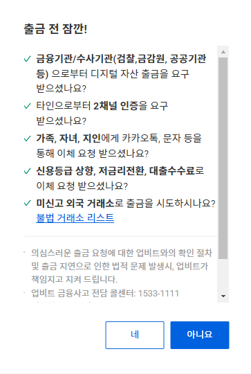 ‘네’를 누르면 출금이 불가합니다.