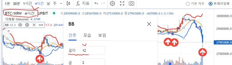 이때 볼린저 밴드의 색상은 눈에 띄게 해주는 것이 중요하다