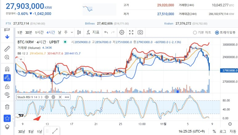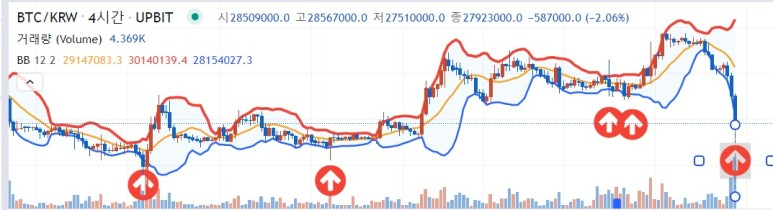 4시간 차트로 하단 밴드 이탈이 일어나면 매수 준비 타이밍이다 이때 필요한 스토캐스틱이나